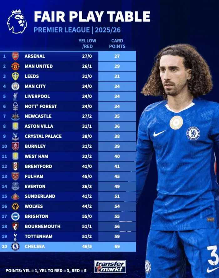 德国转会市场统计了本赛季英超球队获得的红黄牌数量,并按照一定的积分规则进行了排名: