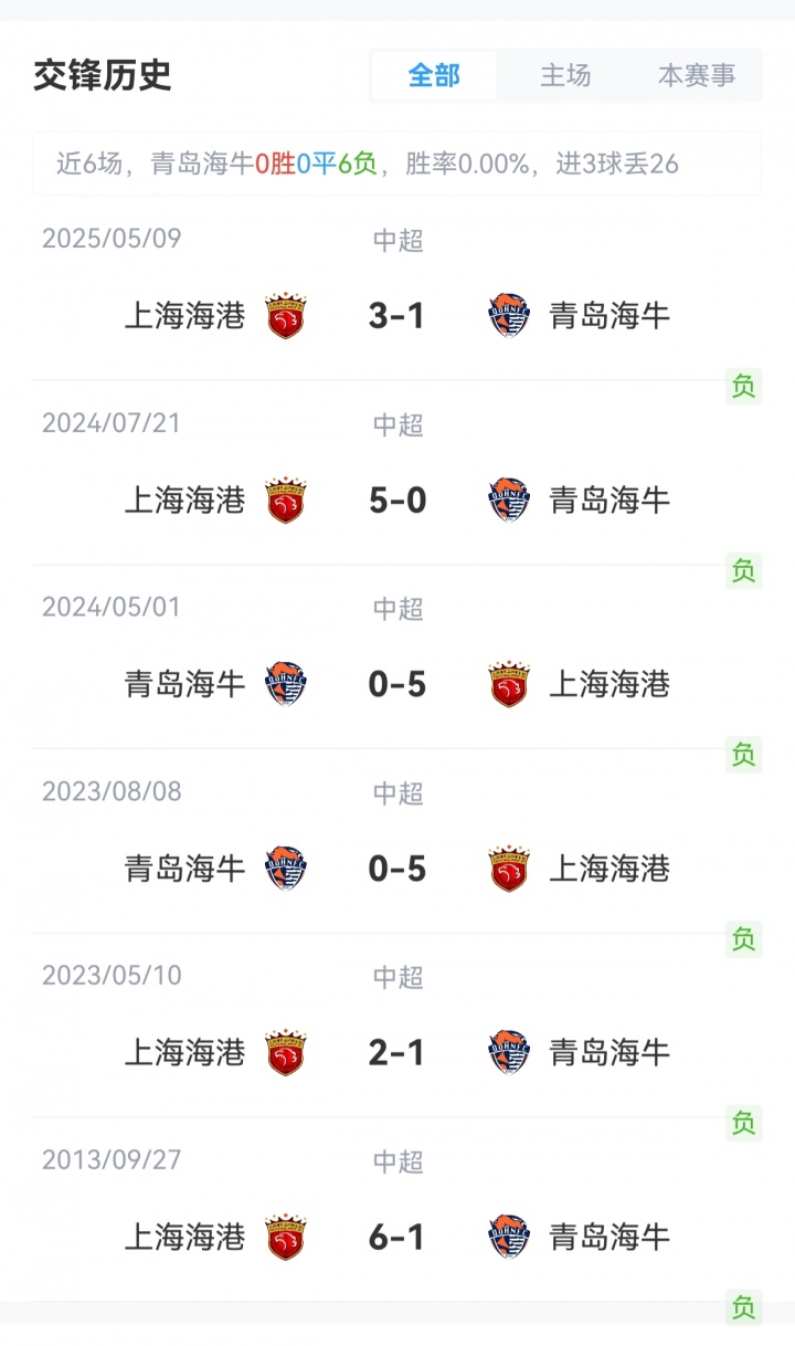 青岛海牛3胜9平14负积18分,排名中超第15;上海海港17胜6平3负积57分,排名中超第1。